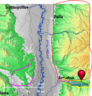 One of the most interesting stories to take place in Gilead occurred when Jacob, living in modern day Iraq, fled from Laban with his wives (Laban’s daughters) and children, on route to Israel. At Mount Gilead, Laban overtook Jacob’s camp and was about to kill him when G-d appeared and warned him not to harm Jacob in any way (Genesis 31). Laban returned to present day Iraq, while Jacob continued on to Israel, going southwards until he reached the Jabbok river (the southern end of the Gilead mountain range).