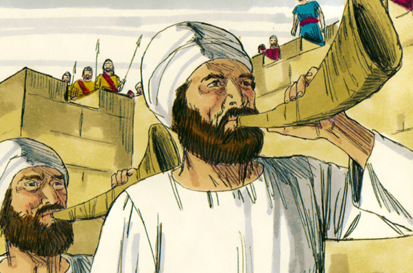 G-d commanded Joshua and his army, along with 7 Kohanim (priests) carrying Shofars (Ram horns which are used as an instrument) and the Ark of the Covenant, to incircle the city, one time each, for the next 6 days. On the 7th day the (priests) and the army encircled the city seven times. After the 7th roundabout, the priests blew the Shofar, and the Children of Israel screamed out and the walls sunk into the ground, which easily allowed the Jewish people to conquer and destroy the city. According to Jewish sources, the reason it sank deep into the ground (as opposed to tumbling down) was because the walls were so large that had they fallen above ground, the ruins would still act as a barrier to the Jewish army. Therefore G-d caused it to sink deep into the ground.