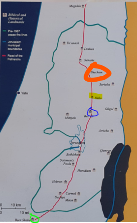 The ancient spine route, also known as Highway 60. The Bible clearly identifies Shiloh’s location (highlighted in yellow) along this path, situated between Beit El (marked with a blue circle) and Shechem (marked with an orange circle) on the highway’s eastern side.