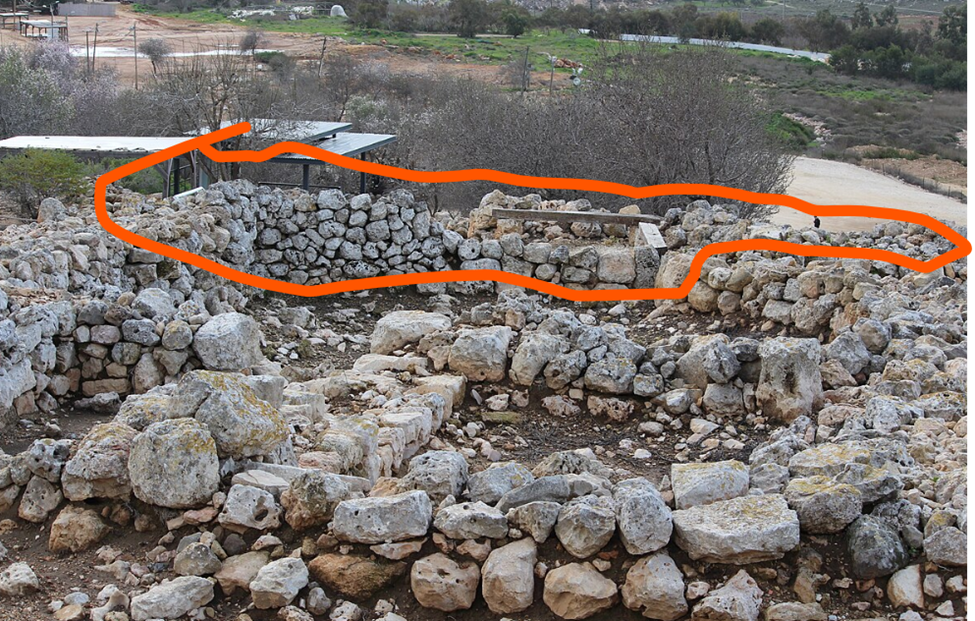 The ruins of the Canaanite city walls (marked in red) still stand strong after 3,800 years. In the foreground, you can see the remains of Israelite homes from centuries later—a powerful glimpse into Shiloh’s long, layered history. Photo Credit: Deror Avi – Wikicommons