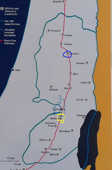 Coming from Shechem (blue circle) they took the Road (Red line) to Bethlehem (Yellow circle).